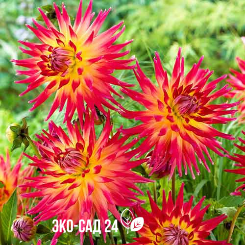 Характерной особенностью это группы растений являются свернутые трубочкой лепестки, вернее, их наружная часть. Это делает их игольчатыми, с эффектно заостренными краями. Ближе к основанию цветочной корзинки они желтые, к краям же делаются пурпурно-алыми. Покупайте клубни георгины Бора Бора – крупные «звезды» пышных цветков с пламенеющими лепестками хороши на клумбах, в цветниках и миксбордерах!