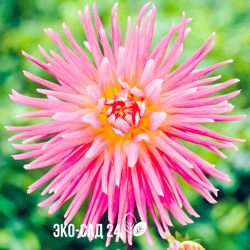 Георгина Нью Дименшион — ярко-розовый сорт из группы кактусовых с крупными эффектными цветками диаметром до 20 см. Лепестки свернуты в плотные трубочки, которые сужаются к концам, и образуют плотный густомахровый цветок с желтым отсветом по центру. Несмотря на внушительные соцветия, сами кусты компактные и устойчивые, достигают высоты 80 см и не нуждаются в опоре. Цветение начинается в середине лета и при условии теплой осени может продолжаться до первых ночных холодов.