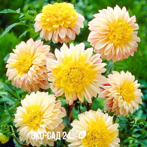 Георгина Полька — недавно выведенный, редко встречающийся сорт, отличающийся оригинальностью окраса цветов и необычной формой соцветий. Растение дает махровые анемоновидные цветы диаметром 5−8 см. Сердцевина желтая. Раскрывшиеся лепестки как бы подпудрены и по мере удаления от центра приобретают розоватый оттенок. Растение можно выращивать в открытом грунте и контейнерах.